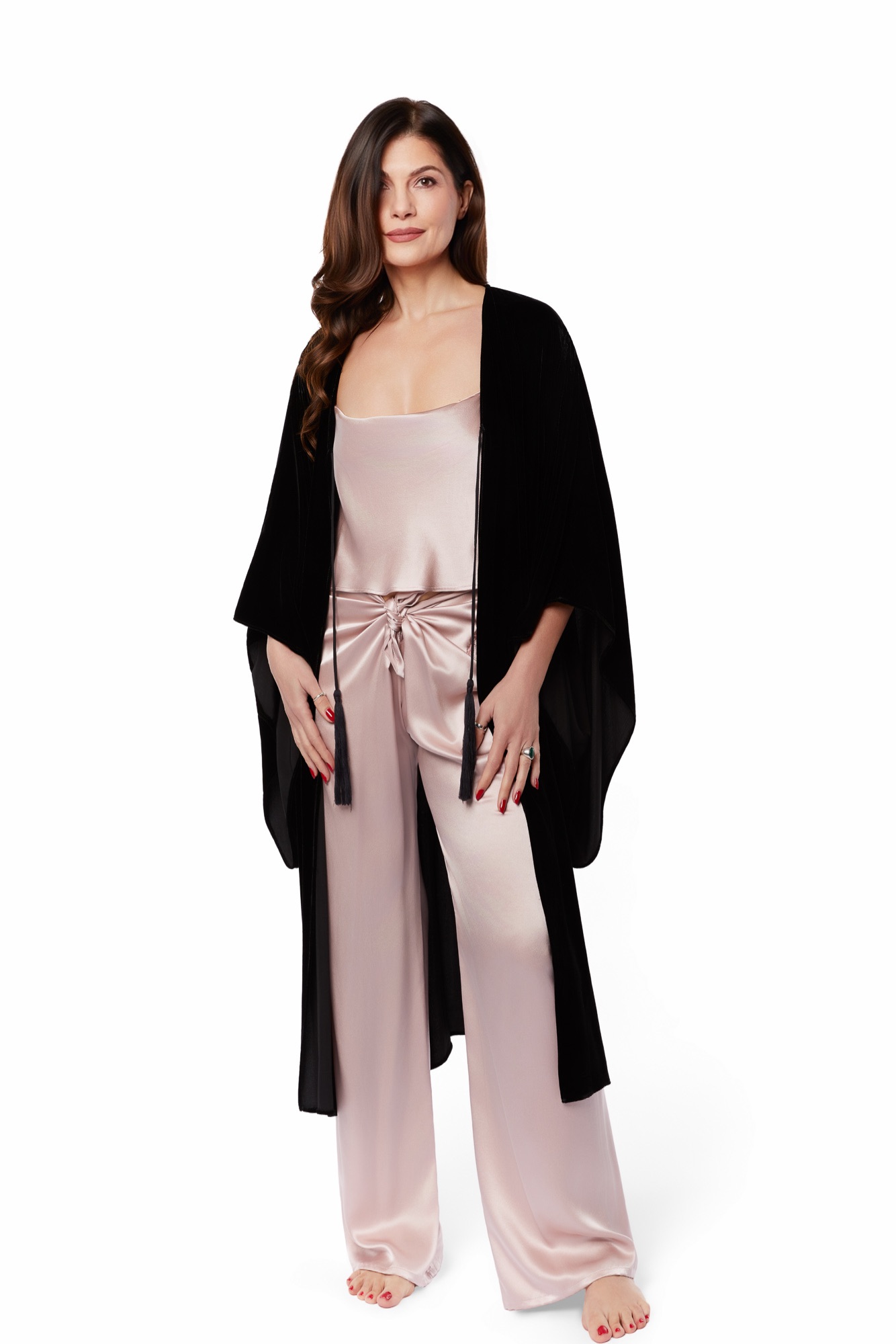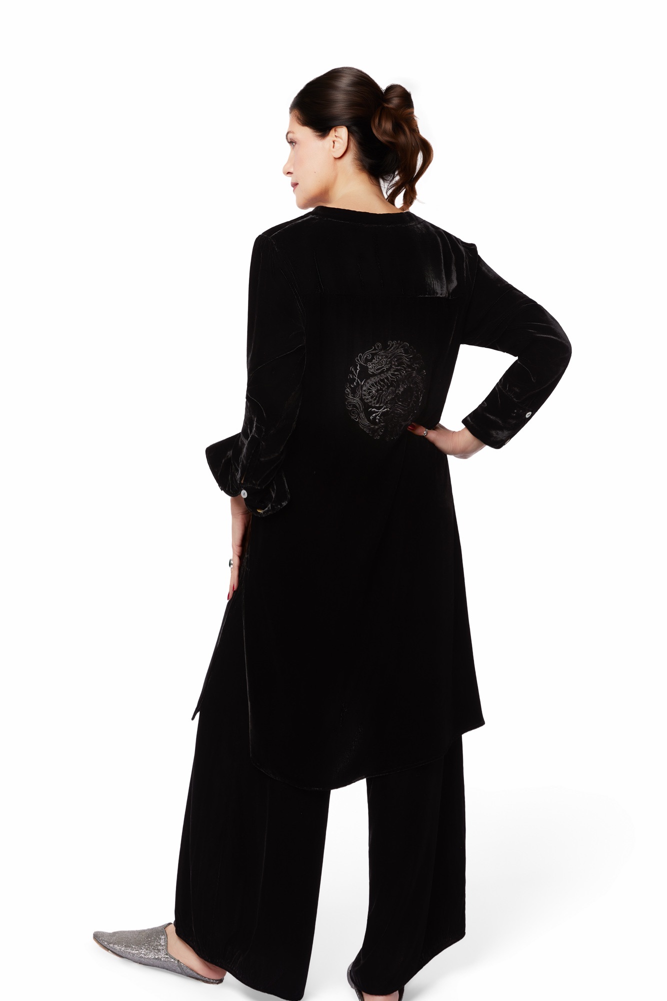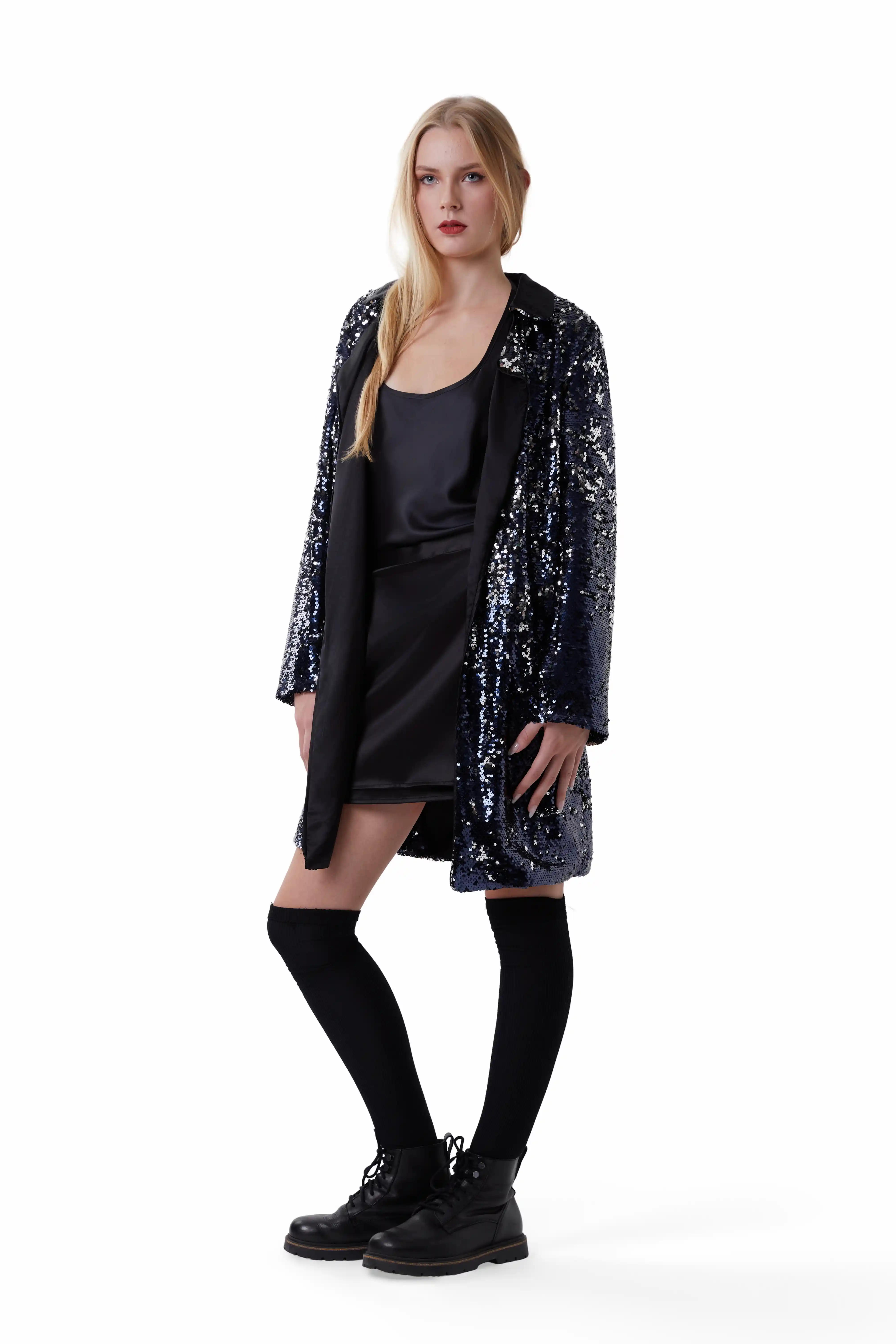 スパンコールのついたダスターコートやジャケットは、純絹の裏地付きでボタンがなく、高級なカーディガンのように着用できます。洗練された、流れるような、自由なシルエットです。